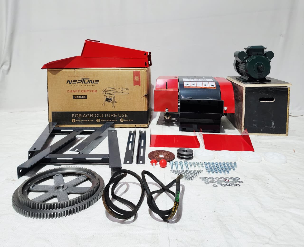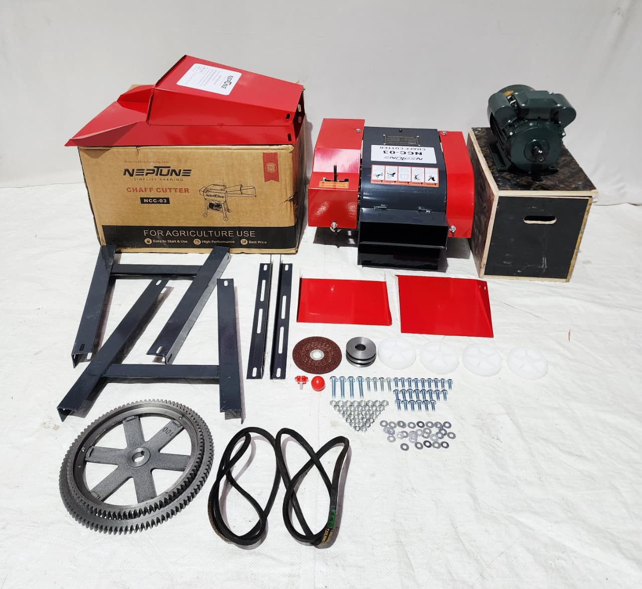 PACKAGE INCLUDED - 1X Chaff Cutter with 3 HP motor, 1x Inlet Funnel, 1x Hopper, 1x Pulley and belt, 1x Outlet Shelter, 4x Wheels, 1x Frame, 1x Tool Kit.