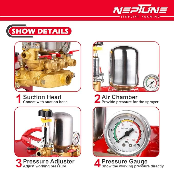 Precision Pressure Control: Offers adjustable output pressure between 20 and 45 kg/cm², providing the versatility to switch between a fine mist and a powerful jet for different crop types.