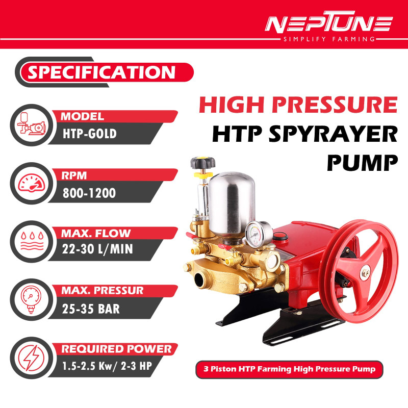 Take your crop protection to the next level with the Neptune HTP 30 Gold. Engineered for high-pressure performance and long-term durability, this triple-plunger sprayer is the gold standard for agricultural and industrial spraying. Whether you are managing vast orchards, dense plantations, or expansive field crops, the HTP 30 Gold delivers the precision and power you need to eliminate pests and diseases effectively.
