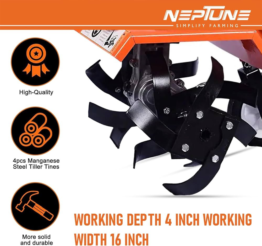 Smooth Handling: Equipped with double rear wheels, the tiller stays stable on uneven ground, reducing vibration and fatigue in your arms and back.