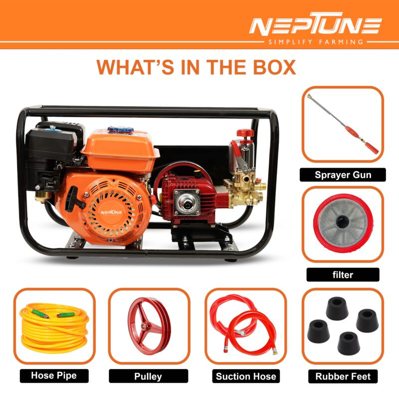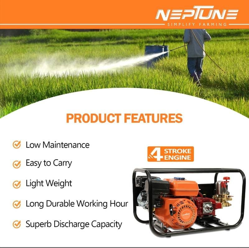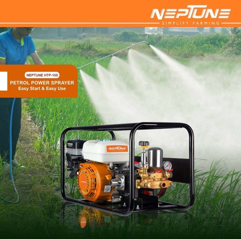 Neptune Portable HTP-168 is a versatile 6.5 HP power sprayer mounted on a sturdy . It features a 50-meter hose for efficient spraying of water, fertilizers, and pesticides over large areas. With its 4-stroke petrol engine and lightweight, portable design, it’s ideal for agricultural use, including mango gardens, tall trees, and indoor areas. The sprayer offers high performance with an output of 13.5-20 liters per minute and includes a recoil starter for easy operation.