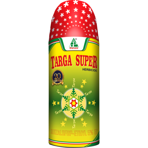 Targa Super quizalofop Ethyl 5% EC is selective, systemic herbicide of Aryloxyphenoxy-propionates group. It is used to control narrow leaf weeds in broad leaf crops. Targa Super effectively controls the narrow leaf weeds like Echinochloa spp., Goose grass, fox tail, Cynodon (doob), Large crab grass, Saccharum sp. , Hemarthria sp. (suttu), Wild sorghum, Volunteer paddy, Volunteer maize, Volunteer pearl millet, etc. Targa Super is very quickly absorbed by the weeds and translocated and kill the weeds. The affected weeds are unable to regenerate. It is quickly absorbed by the weeds, hence rain even one hour after spray does not affect its effectiveness. Weed leaves turn purplish/red within 5-8 days after Targa Super application and within 10-15 days are completely killed.